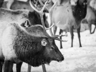 A bull elk in winter coat huddles in a large herd during the harsh cold of winter near Jackson Wyoming at the National Elk Refuge.