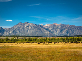 A herd of bison graze in the prairie at the foot of the Grand Teton mountain range evoking images of the old west.