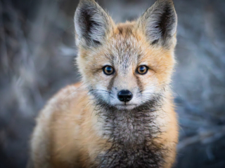 A red fox kit stops to see what his surroundings hold with an expression which makes him appear as if he was caught red handed.