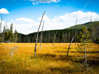 The lonely bent skeletons of long dead lodgepole pines stand, with bent backs surveying their land like crones, in a lush meadow.