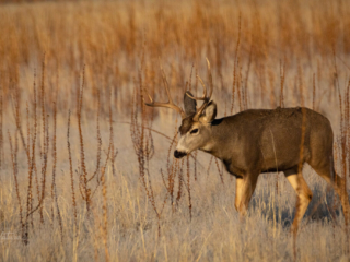 A large mule deer buck moves through the dead winter grass foraging for food before the snow can bury it all.